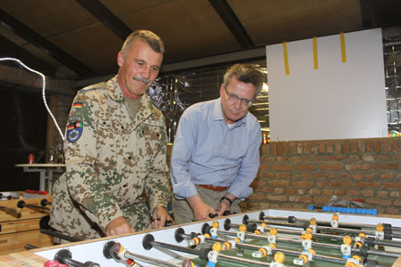 Eine gutes Zusammenspiel: Der ehemalige Verteidigungsminister Thomas de Mazière bei einem Besuch in Afghanistan am Tischfußball mit dem Festredner Alexander Paulus.